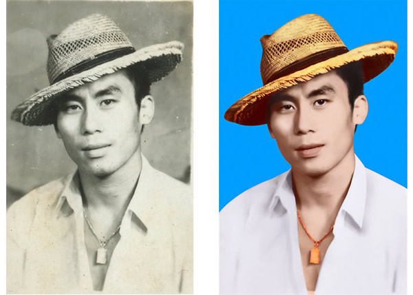 旧照翻新应根据照片本身的破烂程度选择换背景、修复、遮掩等手法。、